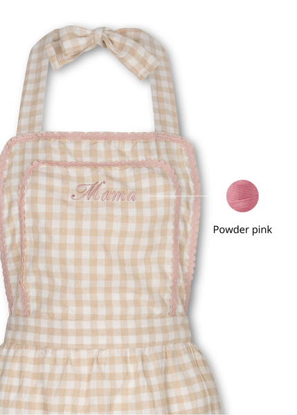 • Stijlvolle checker apron van 100% katoen, gemaakt van een zachte en ademende stof met een tijdloze beige ruitprint en subtiele roze details. De gesmokte bovenzijde zorgt voor een mooie, aansluitende pasvorm, terwijl de losvallende onderkant comfort en bewegingsvrijheid biedt. Het haltermodel met striksluiting maakt de apron eenvoudig verstelbaar. Personaliseer met naam of initialen, met zorg geborduurd in ons eigen atelier – perfect als uniek cadeau of om jezelf mee te verwennen.